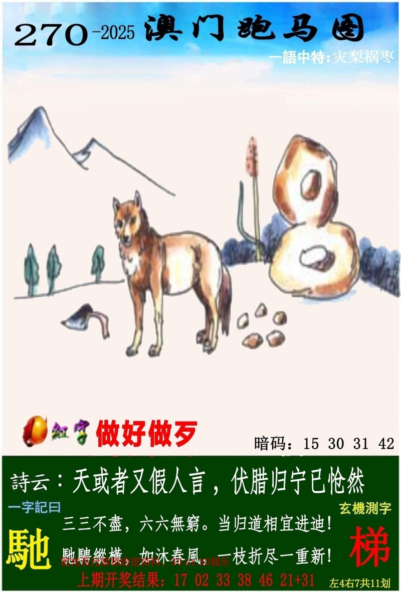 解释:图中是一只马站在桥上,解吉美生肖兔龙蛇马羊鸡,解天肖兔马猴猪牛龙
